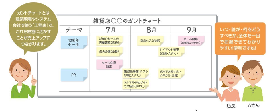 当社では、計画は目標(経営者が考える将来ビジョン・売上などの数値目標)を達成するための手段と考えています。目標を達成するためには、上記の4.行動計画と実際の行動が必要です。そこで、当社では、行動計画を最重点にしたガントチャート式経営計画を活用して、多くの中小企業の売上・利益向上を応援しています。